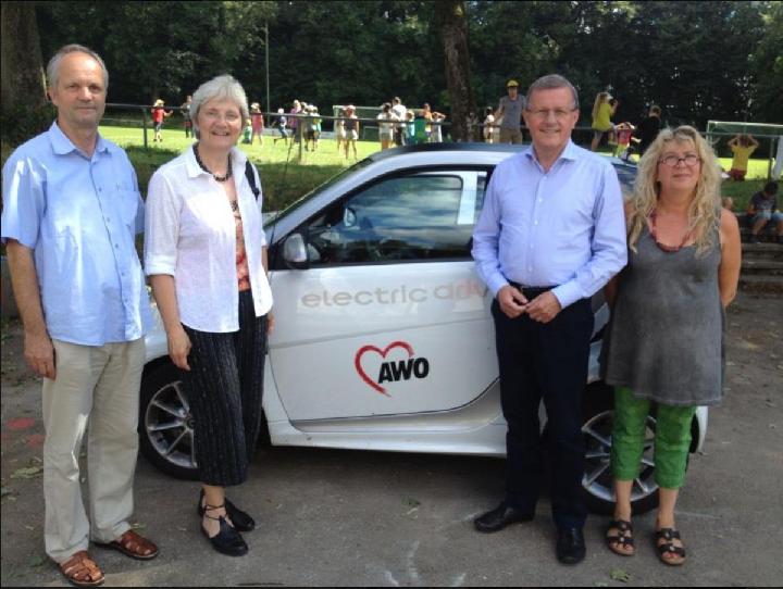 Auf Einladung der SPD-Bundestagskandidatin besuchte AWO- Präsident Wilhelm Schmidt den Kreis Göppingen. Im Rahmen dieser Besuchsreise stand auch ein Abstecher zum Waldheim des AWO Ortsvereins Göppingen auf dem Programm. Dort wurden die Gäste vom Kreisgeschäftsführer Jürgen Hamann erwartet, der aus dem Fuhrpark einen E-Smart mitbrachte, er sonst im umweltfreundlichen Einsatz beim Pflegedienst ist. |