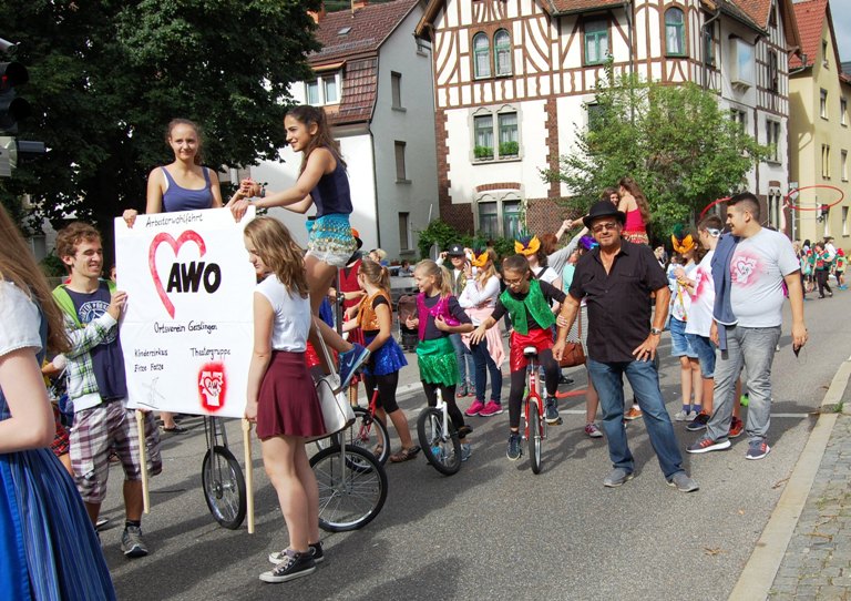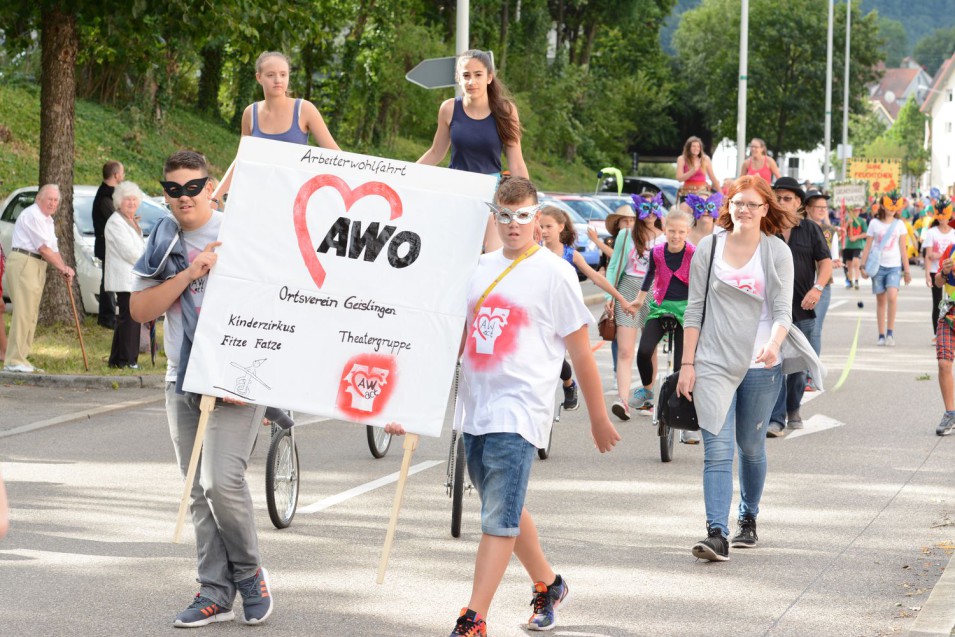 Mit einer großen Gruppe von gut 20 Leuten haben sich die Theatergruppe AWact und der Kinder- und Jugendzirkus Fitze Fatze beim diesjährigen Geislinger Kinderfestumzug beteiligt. In bunte Kostümen und in selbst gestaltete Theater-T-Shirts sowie mit Masken gekleidet, waren die AWO-Aktiven ein Hingucker und ernteten viel Applaus. Auf Ein- und Hochrädern sowie mit Jongliergeräten und als Clown zeigten die Zirkusartisten ihr Können. |