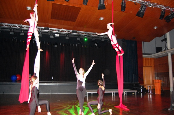 Zum Ende der jüngsten AWO Kreiskonferenz in der Eislinger Stadthalle zeigten 13 Artisten des Zirkus Fitze Fatze ihr Können. Geboten wurden Balanceakte auf Hochseil, Bärenrolle und Laufkugel, Jonglage mit Bällen, Hoops und Keulen sowie Luft- und Bodenakrobatik. Auch der Humor kam in Person der vier Zirkusclowns nicht zu kurz. Die Nummern und Clownsszenen wurden von den anwesenden AWO-Delegierten mit viel Applaus bedacht. |